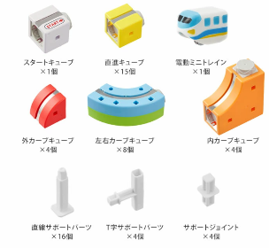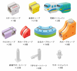| セット内容 | ・スタートキューブ×1 ・直進キューブ×31 ・電動ミニトレイン×2 ・クロスキューブ×2 ・外カーブキューブ×8 ・左右カーブキューブ×16 ・内カーブキューブ×8 ・直線サポートパーツ×32 ・T字サポートパーツ×8 ・サポートジョイント×8 | ・スタートキューブ×1 ・直進キューブ×15 ・電動ミニトレイン×1 ・外カーブキューブ×4 ・左右カーブキューブ×8 ・内カーブキューブ×4 ・直線サポートパーツ×16 ・T字サポートパーツ×4 ・サポートジョイント×4 |